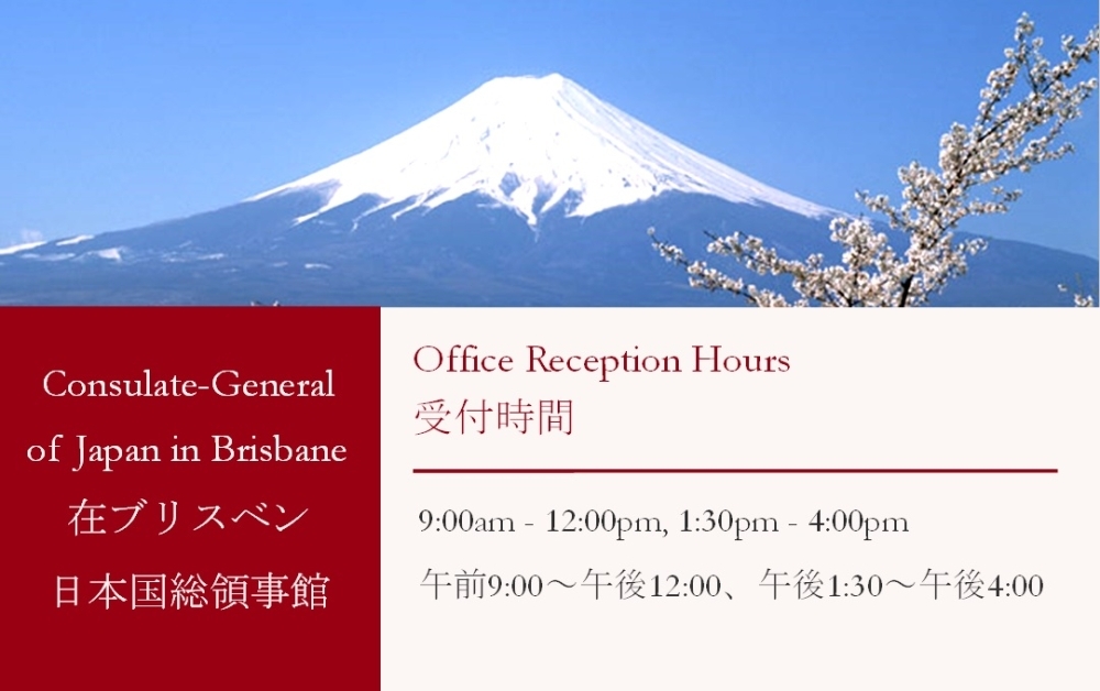 さらに表示する more フェイスブック Consulate-General of Japan in Brisbane 受付時間 3か月以上海外に滞在する方は在留届をお忘れなく ジャネット・ヤング州総督表敬 デビッド・クリサフリ州首相表敬 パトリック・ウィアー州議会議長表敬 デビッド・ジャネツキ州財務大臣兼エネルギー大臣兼住宅所有大臣表敬 ロスリン・ベイツ州予算・貿易・雇用訓練大臣表敬 エイドリアン・シュリナー ブリスベン市長表敬 デール・ラスト州天然資源鉱山大臣兼製造大臣兼地域・地方開発大臣表敬 フィオナ・シンプソン州女性・女性経済安全保障担当大臣兼先住民・トレス海峡諸島民パートナーシップ担当大臣兼多文化主義担当大臣表敬 ティモシー・マンダー州スポーツ・レース担当大臣兼オリンピック・パラリンピック担当大臣との面会 ジョンーポール・ラングブローク州教育・芸術大臣表敬 ジャロッド・ブレイジー 州副首相表敬 トム・テイト ゴールドコースト市長表敬 事務補助員の募集 領事窓口のご利用はオンライン予約制となっています。 ➤➤領事窓口のご来館予約はこちら(Click Here) 来館方法(エレベーター利用方法)の変更について(2025年6月23日から) 在留届及びたびレジ登録のお願い 邦人・日系人団体、日本語対応可能医療機関及び旅行代理店一覧 新着情報 閉じる 石川県能登半島地方を震源とする地震に関する義援金について 2026年 2026年 総領事からのご挨拶 2025年 11月25日 【安全情報】学生卒業イベント「Schoolies」に伴うトラブル防止に関する注意喚起 [98KB] 11月21日 「海外進出日系企業数動向調査(海外進出日系企業拠点数調査)」に ついてのお知らせ及び御協力のお願い 8月18日 夏季休暇期間中における動植物検疫の強化に関する留意事項について [74KB] 4月29日 ゴールデンウィークの海外渡航者に対する感染症予防啓発について [131KB] 大型連休における動植物検疫の徹底について [69KB] 4月10日 DV及びハーグ条約に関する情報セッション・各種無料相談会開催のお知らせ(当館共催イベント) 4月7日 令和7年度前期 教科書配布遅延のお知らせ 3月21日 令和7年度補習授業校指定の募集 [124KB] 3月17日 在外公館で旅券及び証明を申請する際の戸籍謄(抄)本の提出について [68KB] 消費税免税制度における別送の取扱い廃止のお知らせ [112KB] 3月9日 【安全情報】悪天候による臨時閉館のお知らせ [118KB] 3月8日 【安全情報】サイクロン「アルフレッド」による影響について [114KB] 3月6日 【安全情報】サイクロンによる各種交通機関への影響について [94KB] 3月5日 臨時閉館のお知らせ [85KB] 3月4日 【安全情報】サイクロンの接近について [125KB] 2月20日 令和7年 天皇誕生日祝賀レセプションの開催 1月30日 令和7年 新年祝賀レセプションの開催 2024年 12月24日 当館入居ビルの閉鎖について(12月27日) 年末年始に海外渡航される皆様へ~感染症に注意しましょう! 12月5日 パワーなでしこ ブリスベン&ゴールドコースト イベント開催(2025年1月)のお知らせ 12月2日 海外進出日系企業数動向調査(旧:海外進出日系企業拠点数調査)(御協力のお願い) 10月17日 ゴールドコーストにおける各種個別無料相談会(Japan Community of Queensland (JCQ) 主催)のお知らせ 9月13日 2025 年 3 月以降の旅券発給体制の変更等に関するお知らせ 9月4日 ワーキング・ホリデーでオーストラリアへの渡航を考えている皆様へ(注意喚起) 7月19日 「安全の手引き」(令和6年度版) [778KB] 7月1日 運転中の携帯電話の使用に関する罰則について 4月24日 海外での感染症予防について(厚生労働省ホームページ) 海外での感染症予防について(厚生労働省検疫所(FORTH)ホームページ) 3月18日 海外教育(補習授業校の指定:令和6年度要望調査) 2月22日 令和6年 天皇誕生日祝賀レセプションの開催 1月31日 令和6年 新年レセプションの開催 1月25日 2023年 11月28日 相続登記の申請の義務化について(令和6年4月1日~) 10月31日 海外での滞在や生活等に関する基礎調査:アンケートへの御協力のお願い(回答期間:10月30日~11月20日) 3月29日 消費税免税制度変更のお知らせ(令和5年3月29日現在) 過去の情報はこちらです。 安全情報 閉じる 過去の情報はこちらです。 お知らせ 閉じる 日本へ入国・帰国する皆さまへ(Visit Japan Web) 日本へ帰国される方へ:動植物検疫の徹底について 狂犬病抗体検査施設について(農林水産省動物検疫所ホームページ) JPO派遣制度(募集要項等) 豪州入国時のハイリスク持ち込み禁止物品申告を怠った場合の罰則強化(2021年1月1日から実施) 海外にお住まいの方で、日本の年金制度に加入したことがある方へのご案内 「外交政策ニュース」のページ 国際機関で働くことにご関心、興味のある方へ 国際裁判等インターンシップ支援事業 Important 閉じる 総領事館入館時のセキュリティチェックの実施、ならびに館内持ち込み制限物品等についてのお知らせ 外務省海外安全HPなりすましメールにご注意ください 在ブリスベン総領事 ご挨拶 総領事の活動 基本情報 Level 17, 12 Creek Street, Brisbane QLD 4000 TEL:07 3221 5188 FAX:07 3229 0878 領事業務受付時間: 午前9:00~午後